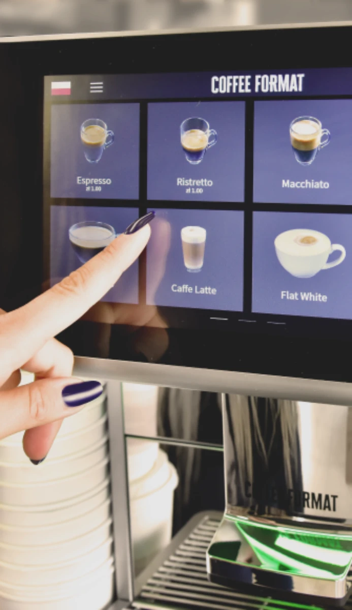 Intuicyjna samoobsługa: jeden ekran, jasne ikony, szybki wybór ulubionych napojów.