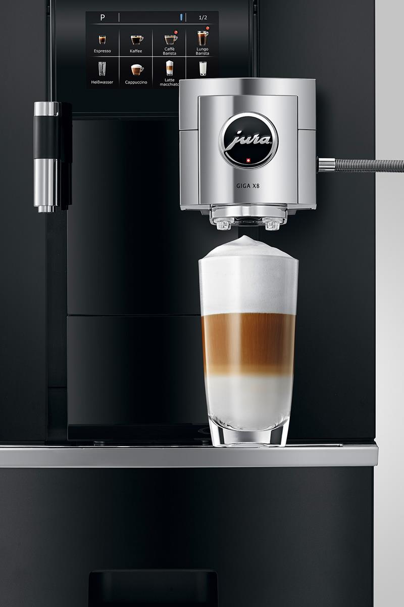 Model GIGA X8 jest wyposażony w podwójną wylewkę z regulacją wysokości o przemyślanej konstrukcji, która dzięki technologii gładkiej pianki umożliwia przyrządzanie modnych specjałów z dodatkiem mleka i pianki mlecznej. Natomiast funkcja Speed umożliwia przyrządzanie specjałów kawowych w rekordowo krótkim czasie.