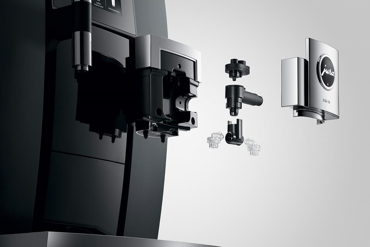 Konserwacja nowego ekspresu GIGA X8 jest tak samo prosta, logiczna i intuicyjna, jak jego obsługa. Oryginalne produkty do konserwacji JURA oraz zintegrowane programy płukania i czyszczenia dbają za naciśnięciem jednego przycisku o higienę, posiadającą certyfikat TÜV. Również czyszczenie systemu mlecznego wyróżnia się przemyślaną konstrukcją. W pełni zautomatyzowane i uruchamiane za dotknięciem wyświetlacza gwarantuje zachowanie perfekcyjnej czystości w kontakcie z mlekiem. Masywna podwójna wylewka da się rozłożyć paroma ruchami. Umieszczone z przodu wylewki wyloty przewodów na mleko są łatwo dostępne i w razie potrzeby można je wymienić w bardzo prosty sposób.
