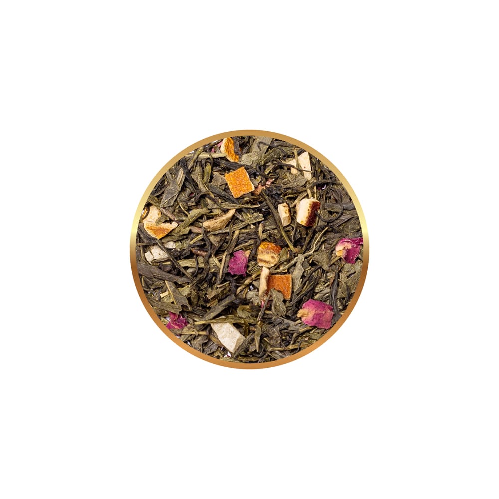 Składniki:chińska zielona herbata Sencha (34%), chińska biała herbata Mao Feng (18% ), zielona herbata Gunpowder (10%), wiśnie (10%), kawałki pomarańczy. Bez konserwantów.